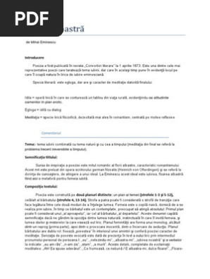 Izvorul asigura fondul musical al idilei identificandu se cu eul liric si preluand starile acestuia. Al cunoașterii infinite absolute cuprins în primele trei strofe. Floare albastra comentariu. Strofa un ansamblu unitar într o poezie format dintr unul sau mai multe versuri în general despartita printr un spatiu grafic de alte unitati de acelasi fel.