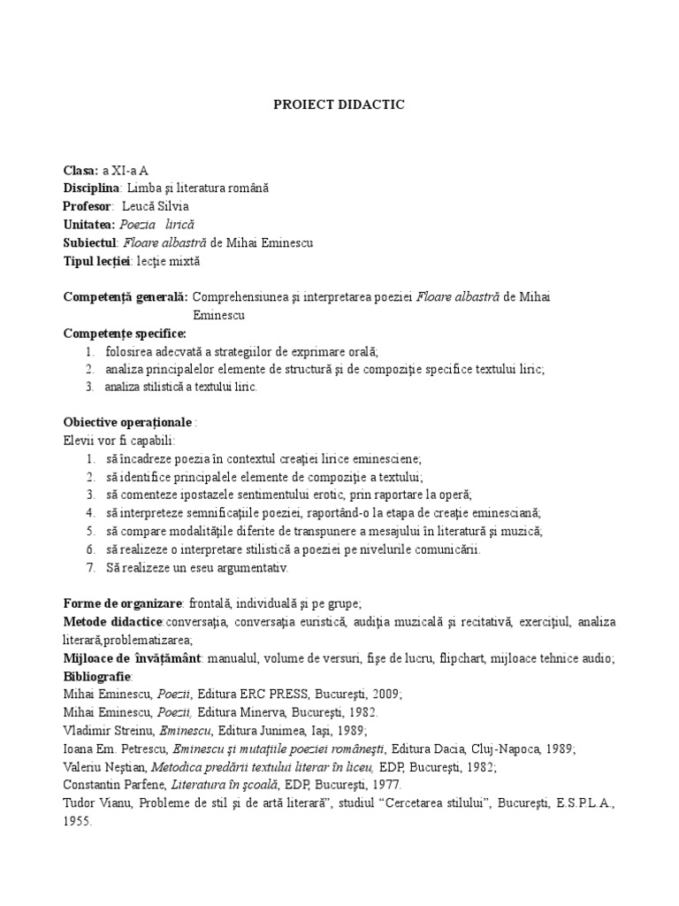 Proiect Didactic Floare Albastra De Mihai Eminescu