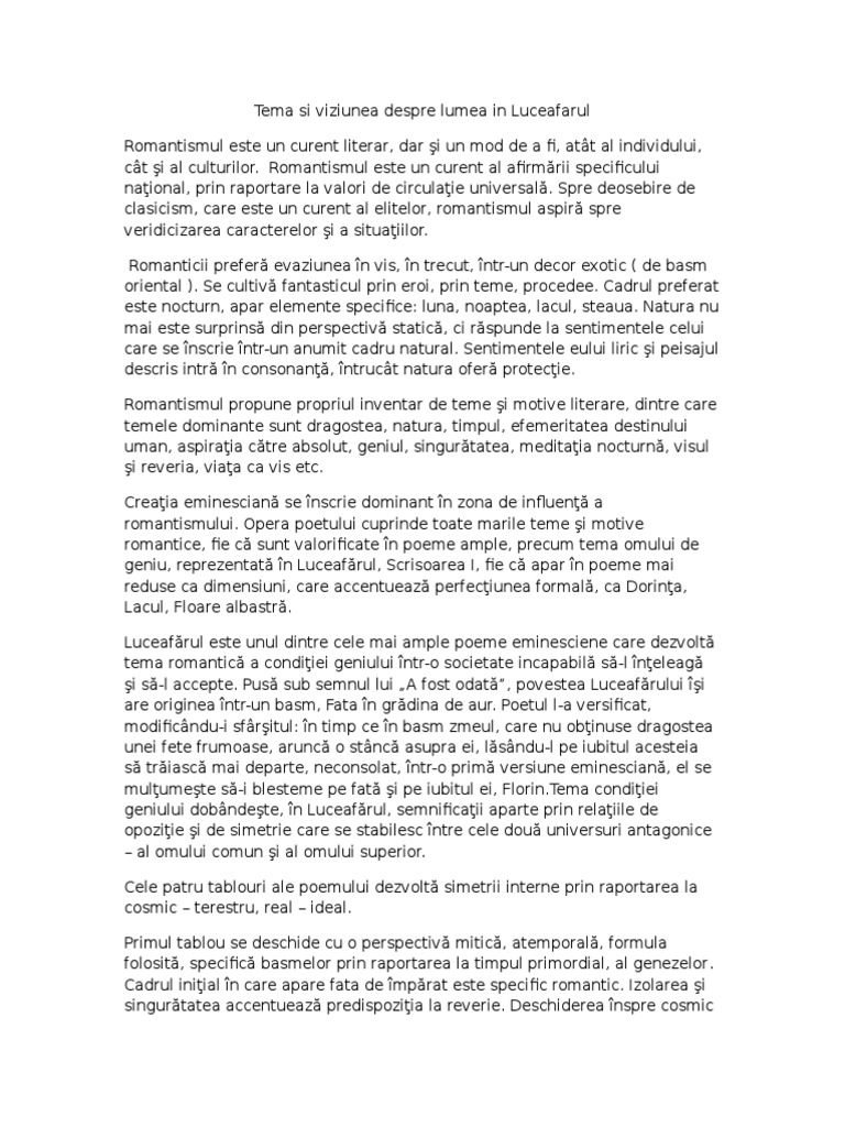 Curent literar sau orientare tematic. Floare albastr de mihai eminescu eseu n care s prezini tema i viziunea despre lume reflectate ntrun text poetic studiat aparinnd lui meminescu. Sublinierea a patru elemente semnificative pentru. Luceafarul tema si viziunea despre lume aparitie.