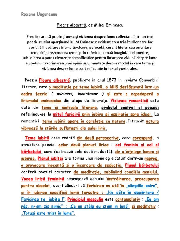 Poezia floare albastra dateaza din perioada studiilor de la viena si berlin ale poetului si a fost publicata in. Floare albastra de mihai eminescu poezia floare albastra a aparut în revista convorbiri literare la 1 aprilie 1873 fiind printre primele poezii publicate în revista convorbiri literare. Eseu floare albastra de mihai eminescu. Evidenierea trsturilor care fac posibil ncadrarea ntro tipologie.