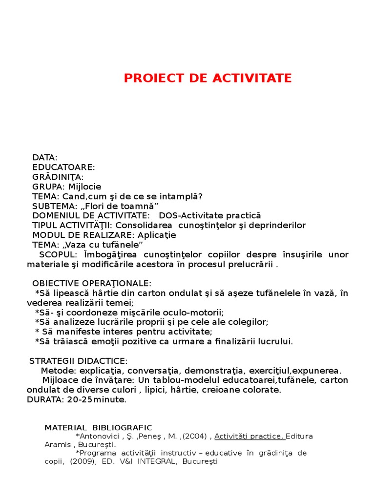 1 proiect de activitate educ. Un exemplu de proiect de activitate artistico plastica la grupa fluturasilor. Acuarele pensule bloc de desen pahar cu apă şerveţel tabloul model. Zona artă după o scurtă conversaţie despre florile de toamnă vor avea de lipit pe fişă seminţe de dovleac pe floare şi frunze uscate pe tulpina şi frunză pentru a realize tema.